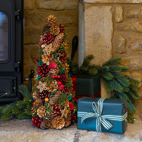 Standing at 45cm tall, this decorative, free-standing cone tree is packed with natural pinecones, winter foliage and bright red berries. It's a rich mix of textures and colour, and it’s been put together with real care. The overall effect is bold, festive, and surprisingly elegant, whether you place it by the fire, on a sideboard, or even as a striking centrepiece.
